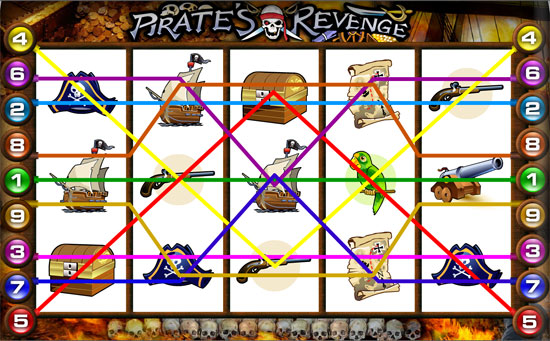 The objective of Pirate's Revenge is to match the symbols of each one of the five reels to a winning combination. This is a five reel multi-pay line slot game which has 9 pay lines. Payouts depend on what symbols will match on a line.